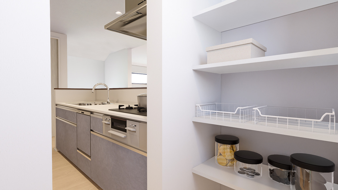 キッチン横のパントリーは、食品や調味料のストック、レシピの収納にも活躍。調理空間をすっきり保ち、使い勝手の良さを高めます。