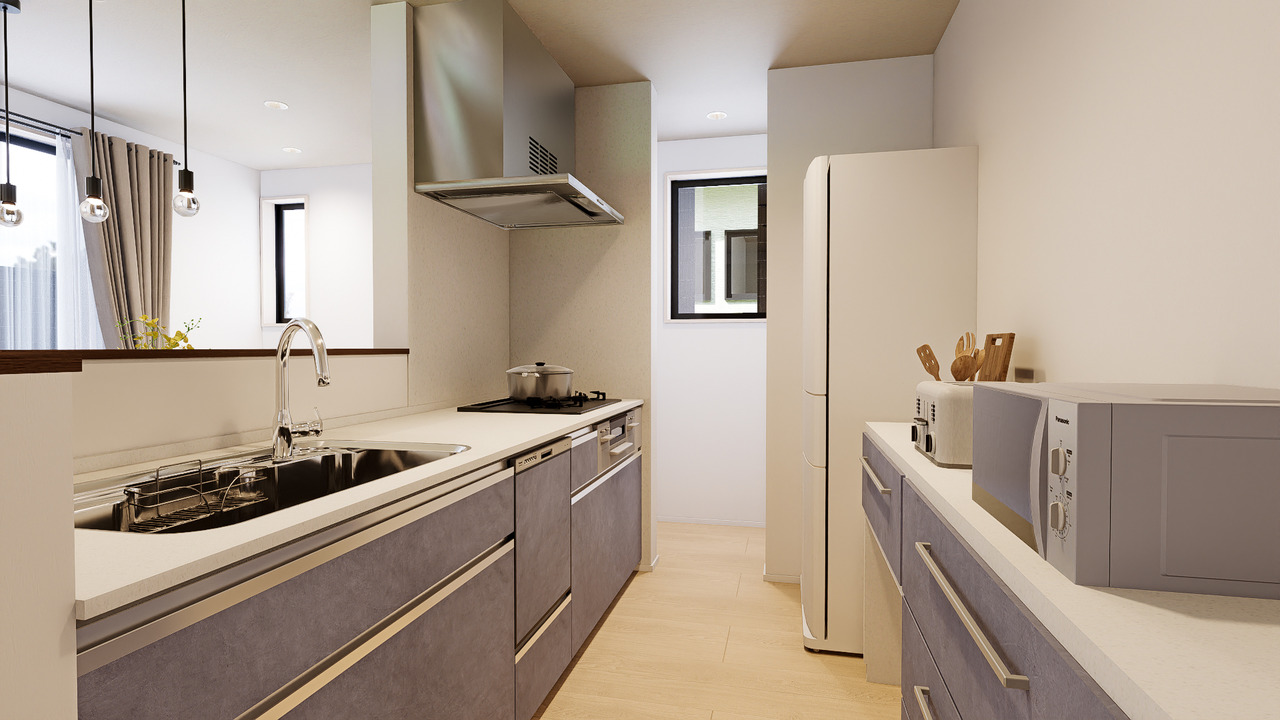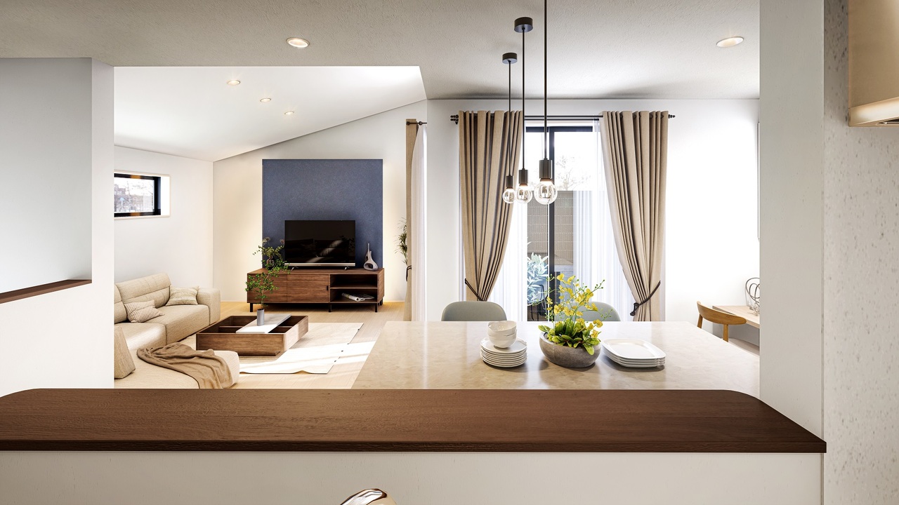 キッチンで作業しながら家族の様子を見ることができるので、料理中もコミュニケーションが途切れません。子供の様子を見守ったり、リビングでくつろぎ家族と会話を楽しんだりと、日常のふれあいを大切にできるレイアウトです。