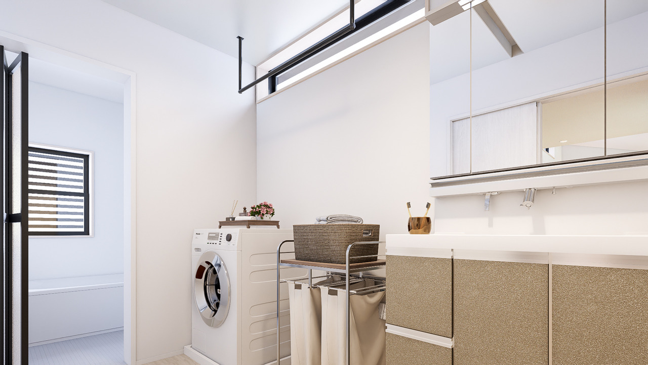 洗面室とファミリークローゼットを一体化。洗濯動線を短縮し、毎日の家事がもっと快適に!!