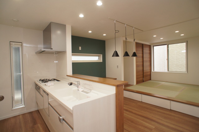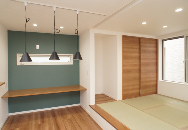 LDK脇の小上がりの和室。来客時に使用するだけでなく、お子様のお昼寝の場所や、アイロンがけや洗濯物を畳むなどの家事室としても便利!