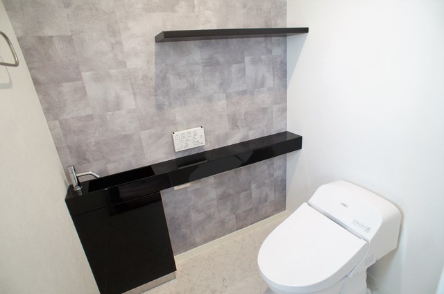 手洗いが設置されたトイレ。見せる収納として活躍できそうな棚も設置されており、便利です。