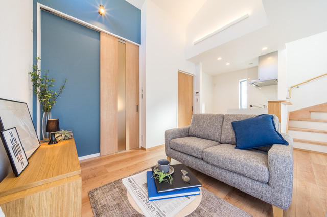 明るい光が降り注ぐ心地のよいLDK。アクセントクロスのブルーがかわいい空間を演出。