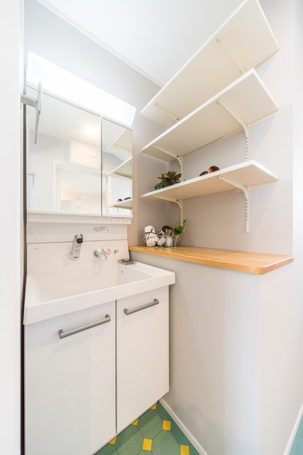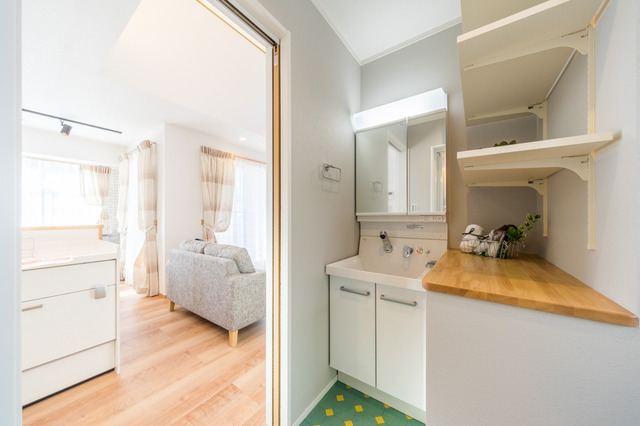 洗面ドレッサーの脇にリネン収納を設置しました。何かと増えてしまいがちなタオル類も上手に整理して収納できそうです。