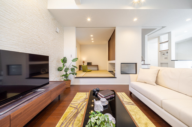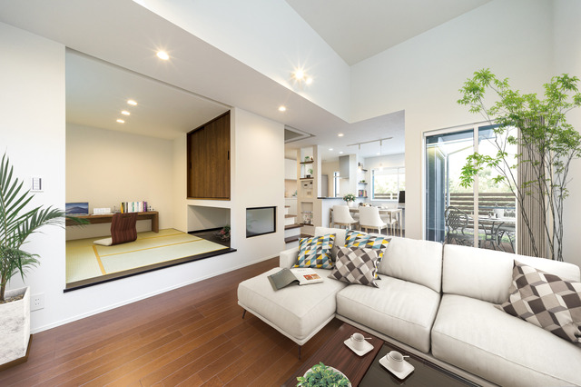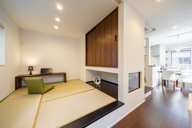 テレワークをするのに最適な和室。1段上がったモダンな和室は吊押し入れが空間を広く感じさせ、来客時に腰掛けることができたり、お子様のお昼寝の空間としても活躍してくれます。