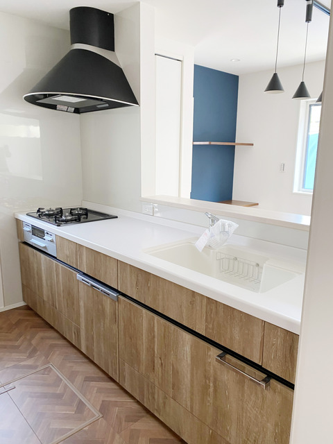 木の温もりがやわらかい対面キッチン。ご主人の「男の料理」を手伝ったり、お子様と一緒にお菓子作りをしたりと家族で楽しめるキッチン。