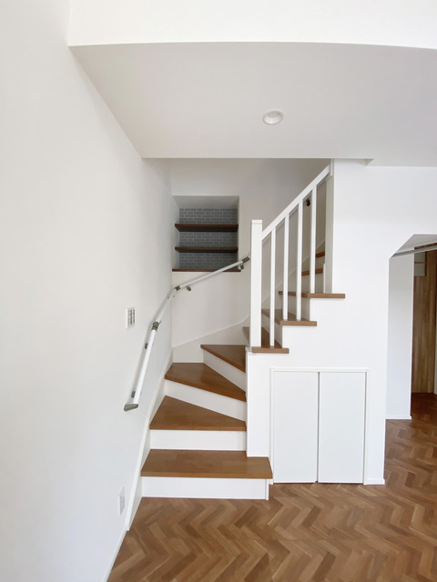 階段の途中に雰囲気のある飾り棚が設置されています。ちょっとした小物を飾ってステキな空間を演出してみてはいかがでしょうか。