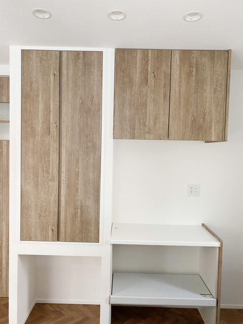 何かと増えてしまうお皿類も上手に整理して収納できる造り付けのキッチン収納。こちらも木の温もりがやさしい雰囲気で揃えられています。