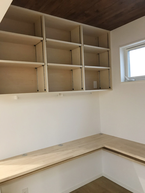 LDKの一角に設置されたスタディーコーナー。造り付けの本棚も設置され、お子様が今日の宿題や工作、お絵かきなどを楽しめる場所になっています。