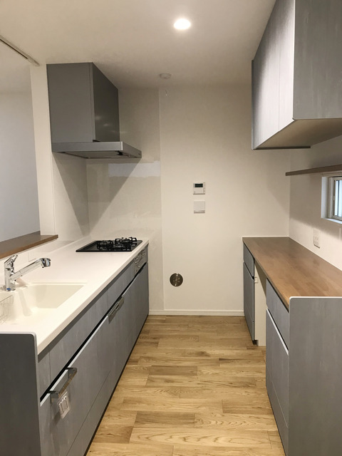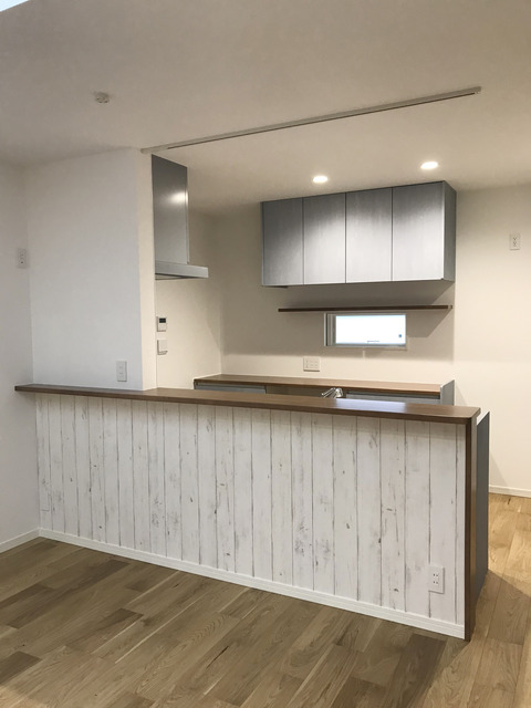 木のカウンタートップと古びた風合いのキッチン。ご主人の「男の料理」を奥様がサポートしたり、お子様と一緒にお菓子作りをしたりと「家族で楽しめるキッチン」です。