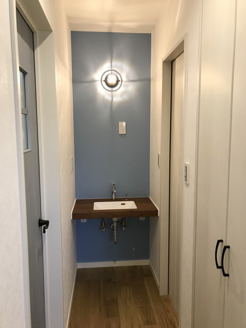 玄関に続く廊下の一角に設置された洗面コーナー。「帰宅したら、まず手洗い!」をお子様に習慣づけられそうです。