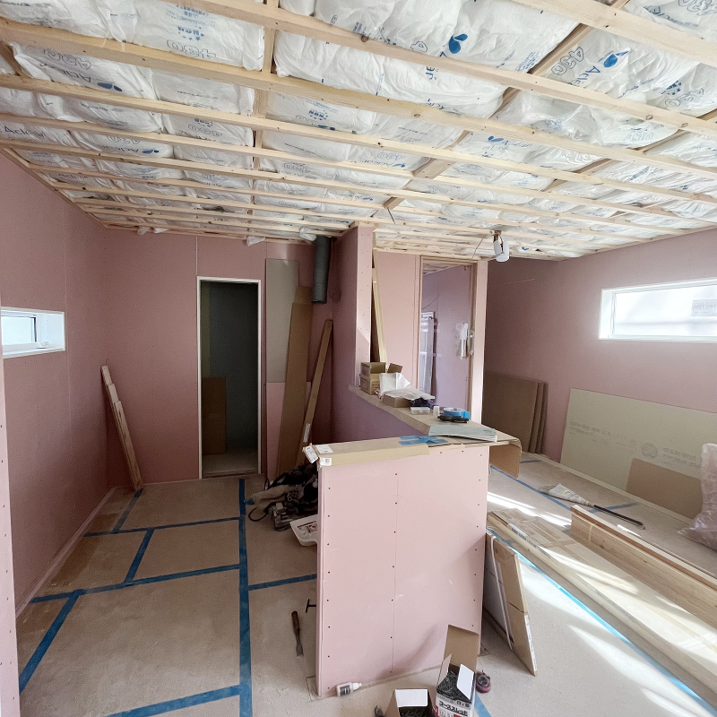 天井断熱材の充填が完了しました。