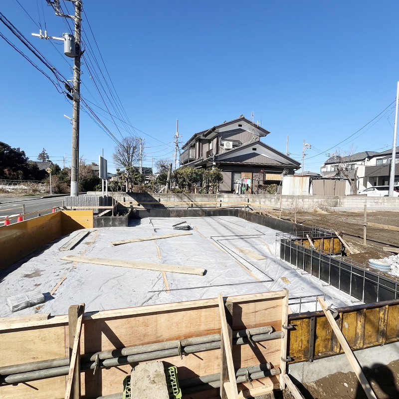 基礎工事 防湿シートが敷かれ、型枠が組まれました。