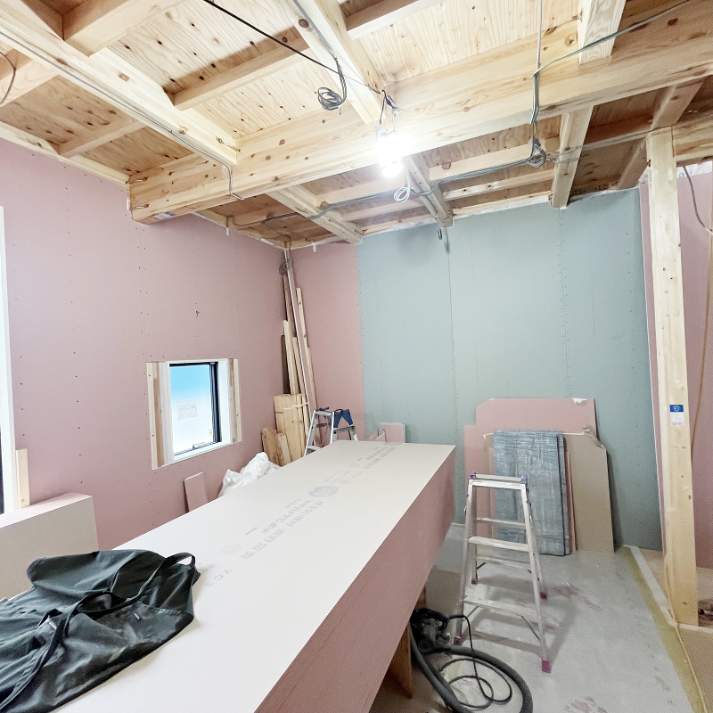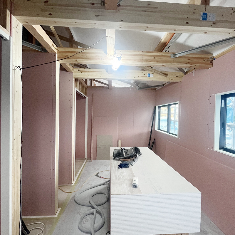 壁面に石膏ボード「ハイクリーンボード」貼りが始まりました。