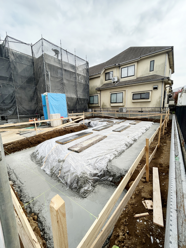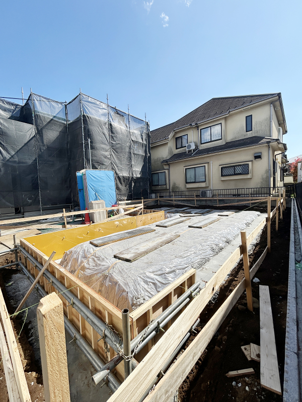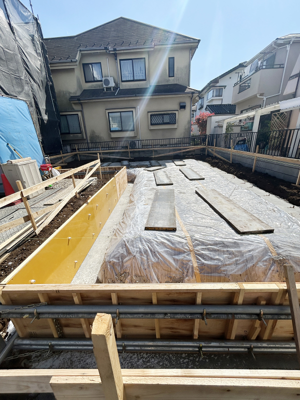 基礎工事 防湿シートが敷かれ、型枠が組まれました。