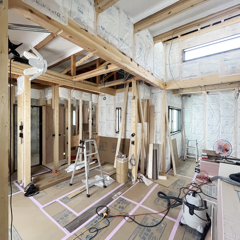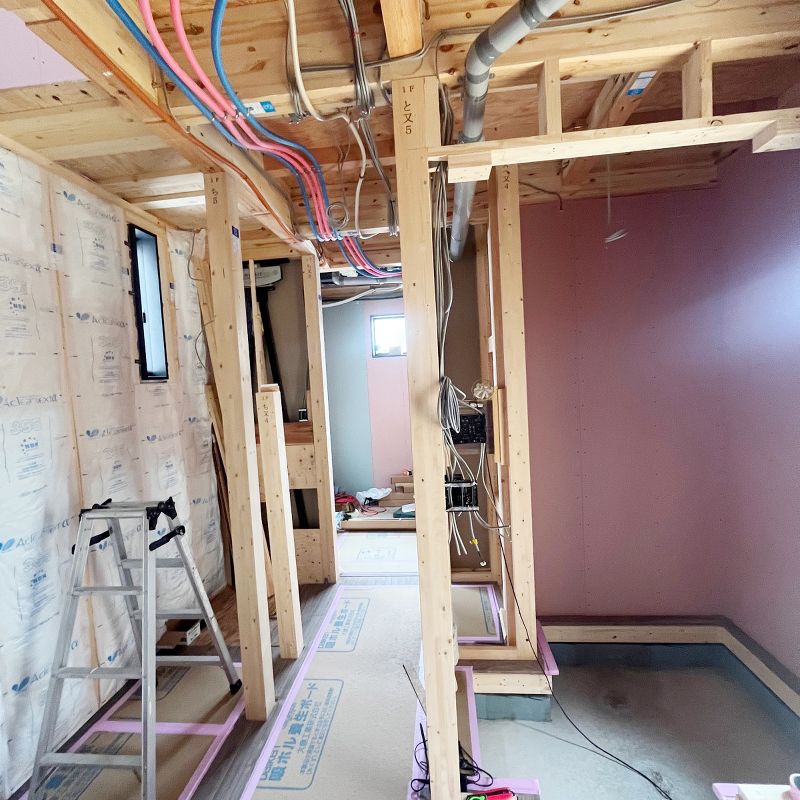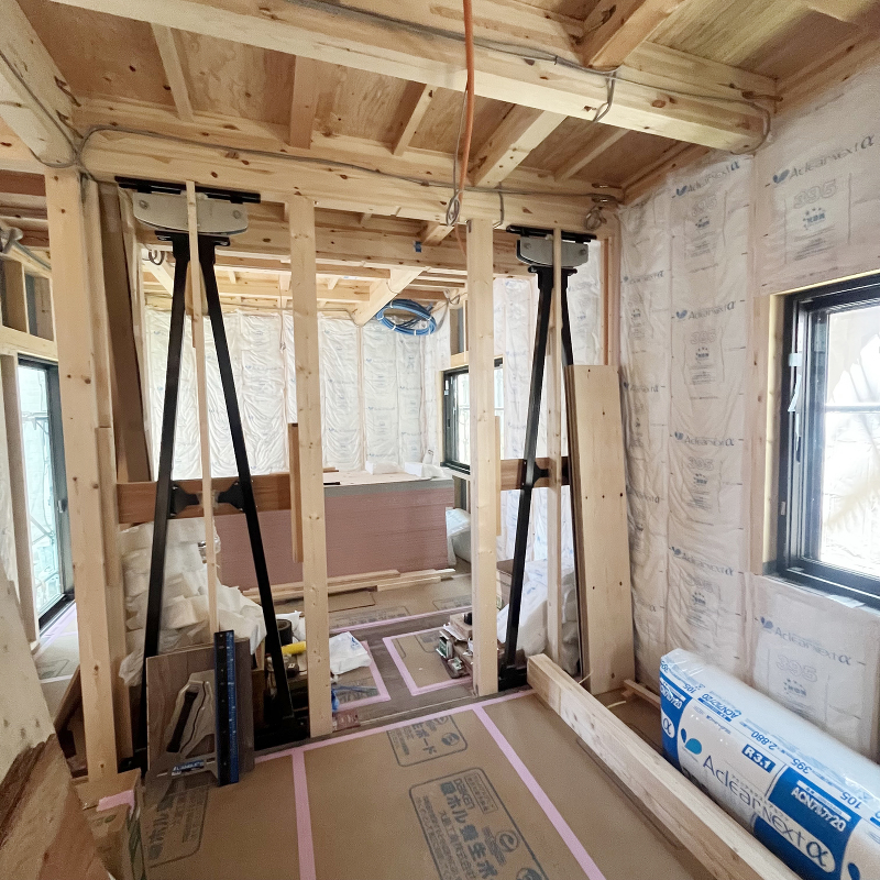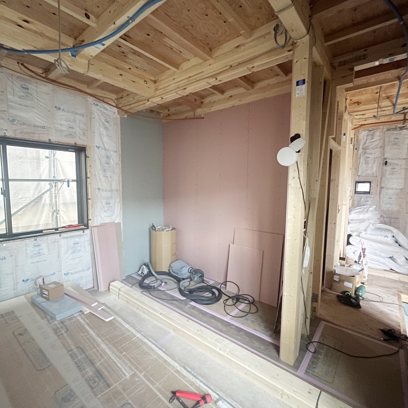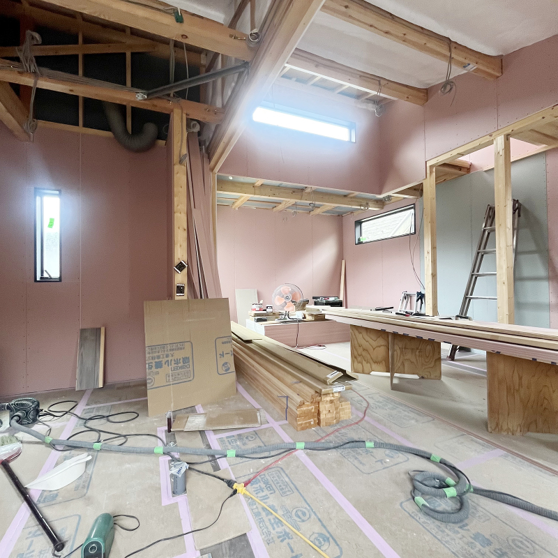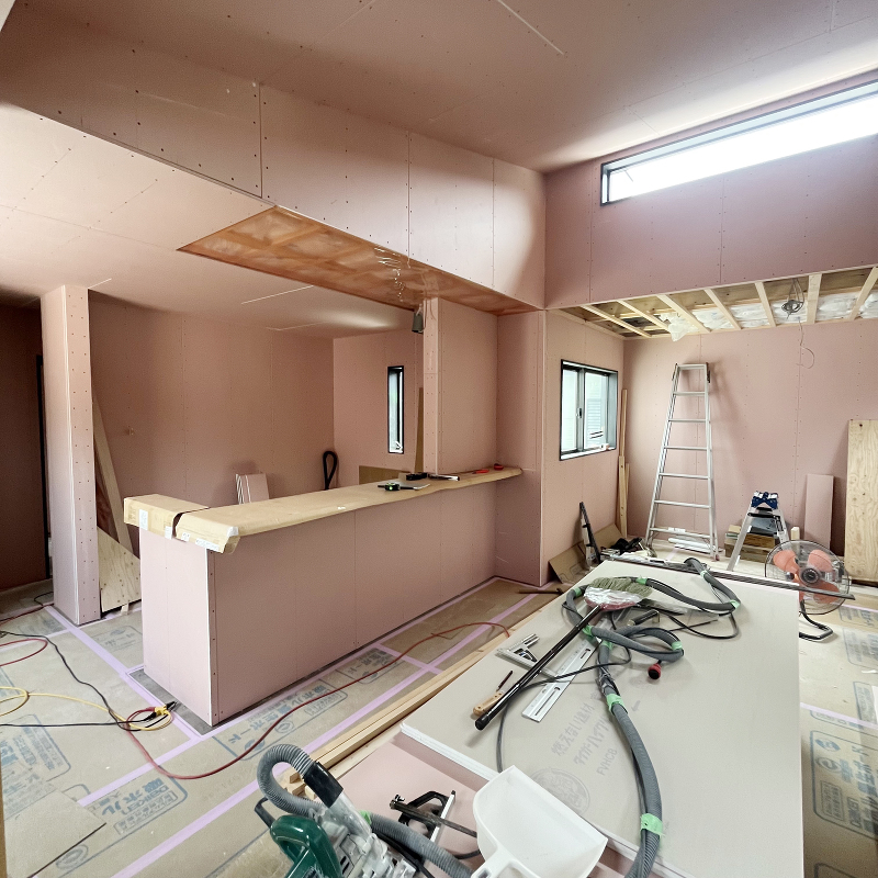 木工事 石膏ボード「ハイクリーンボード」貼りが始まりました。