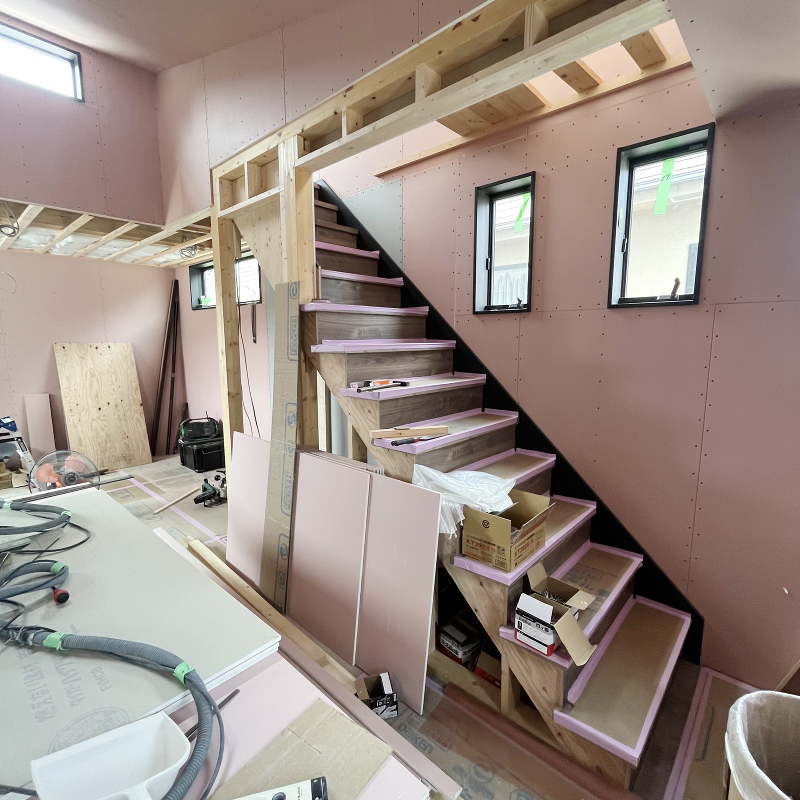 1階、2階に石膏ボード「ハイクリーンボード」貼りが進んでいます。