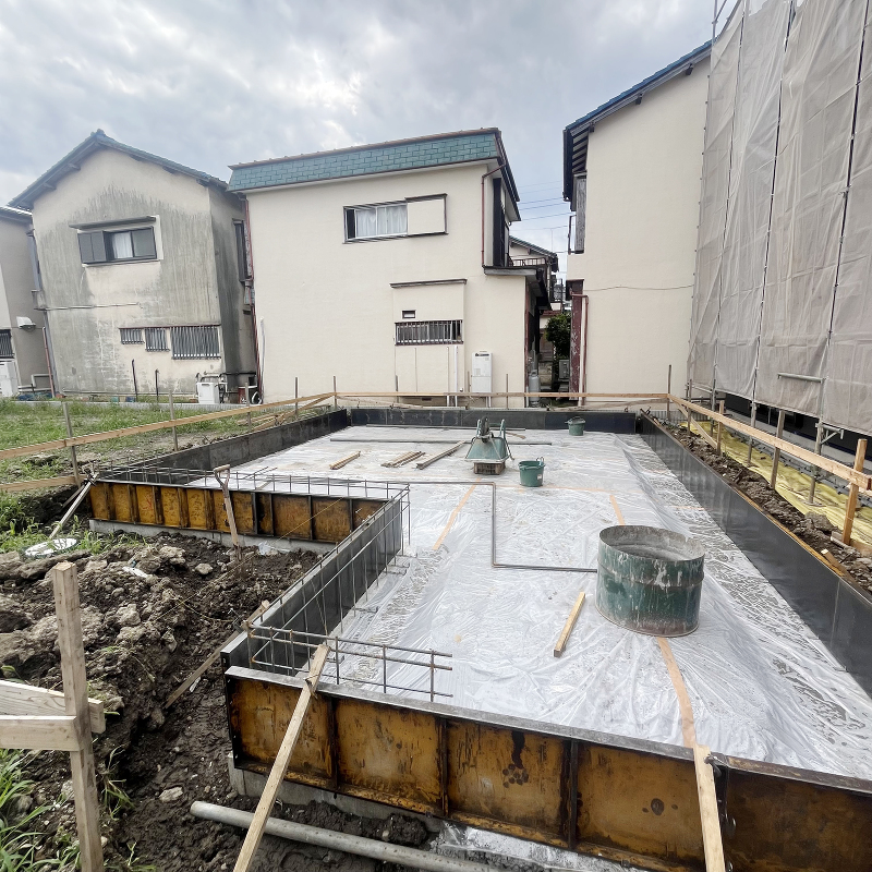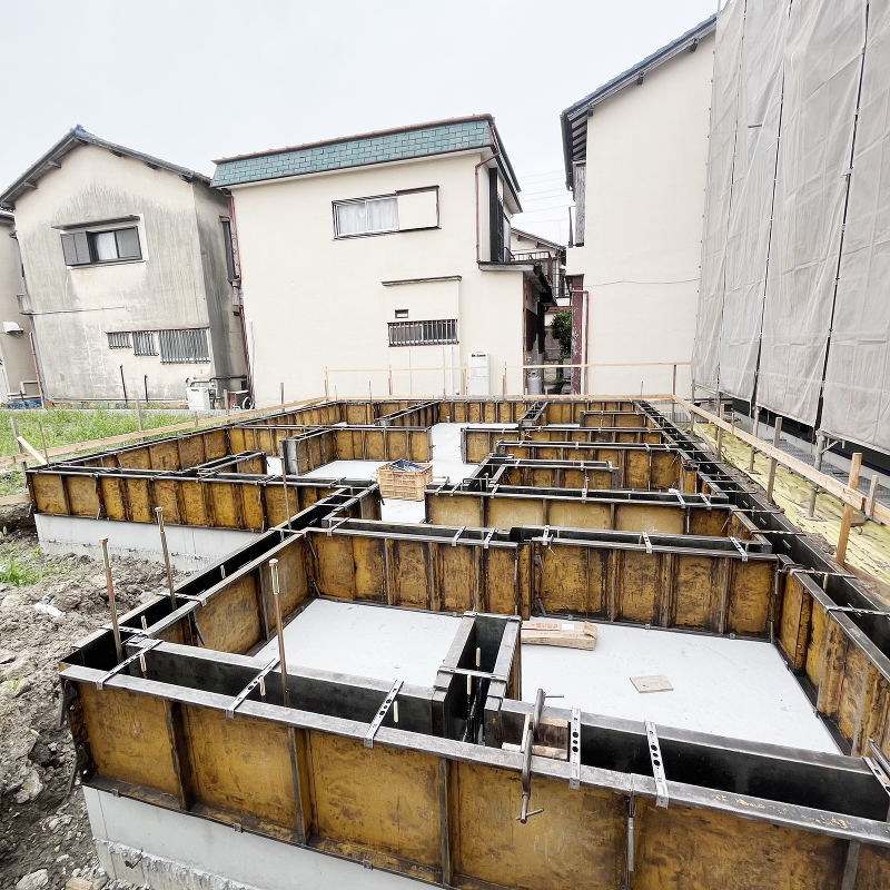 基礎工事 ベースコンクリートが完成し立ち上がり部分が組まれました。