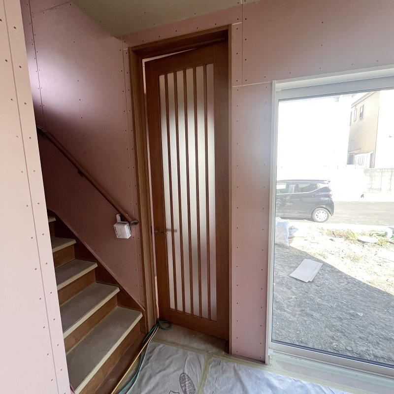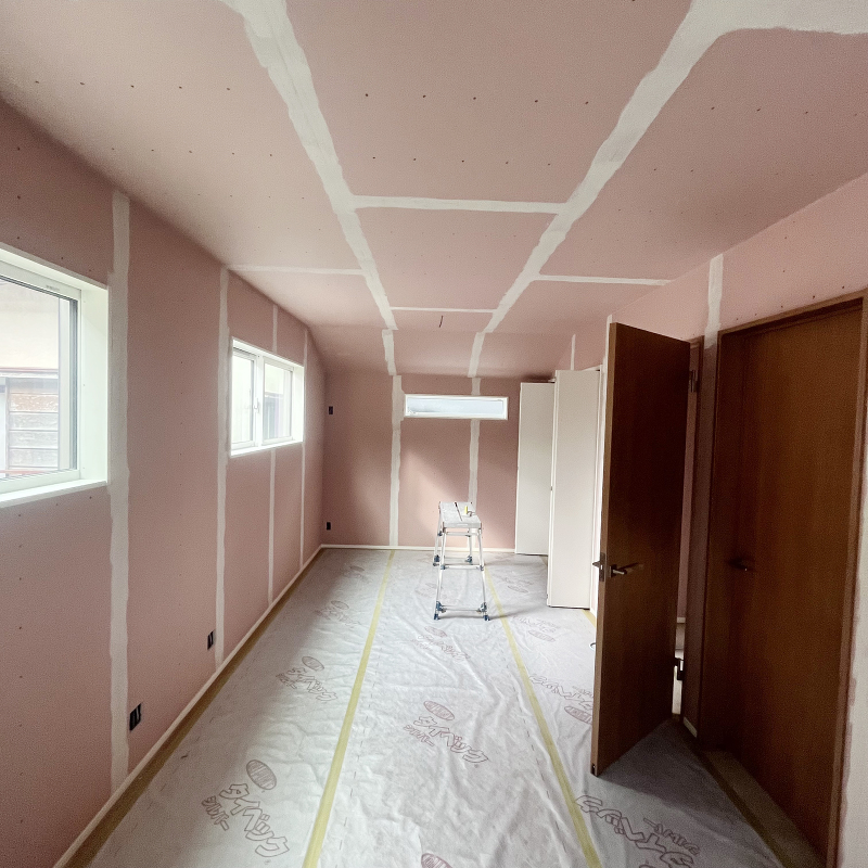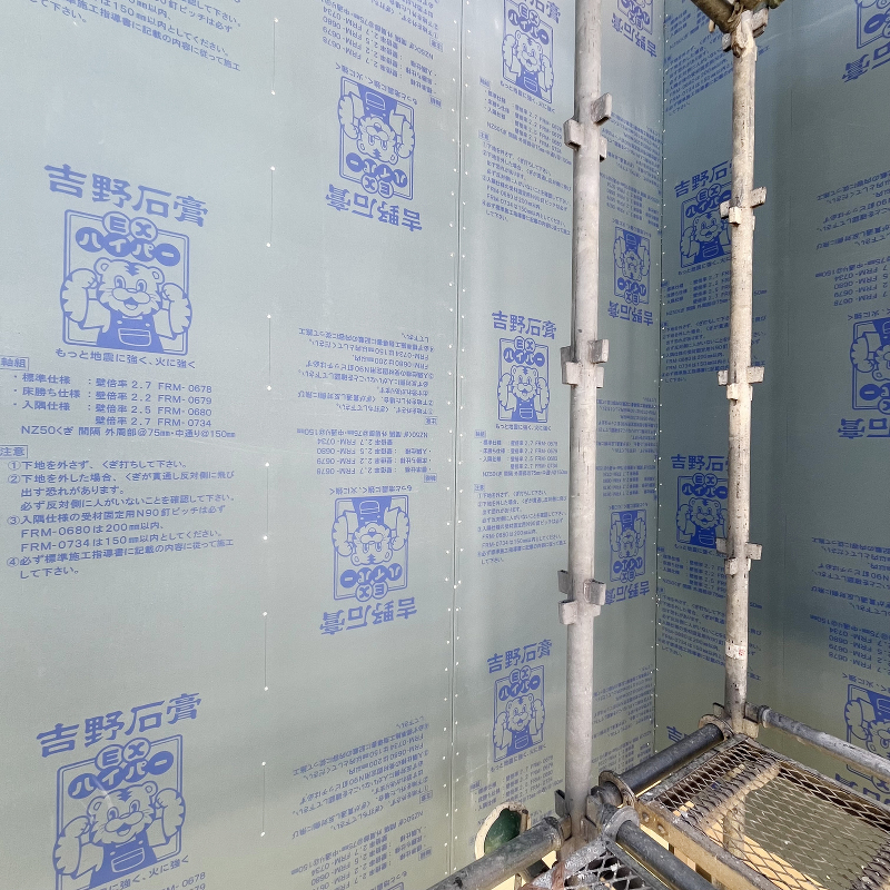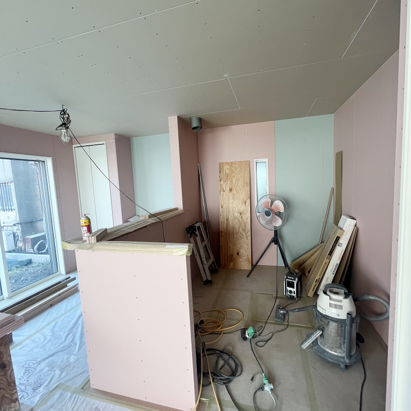 壁面に石膏ボード「ハイクリーンボード」貼りが始まりました。