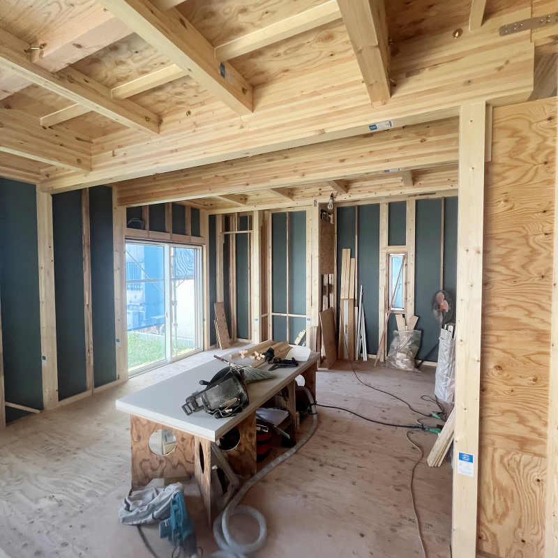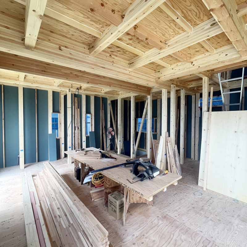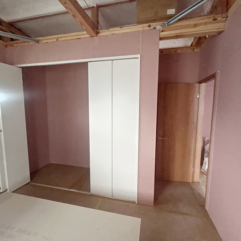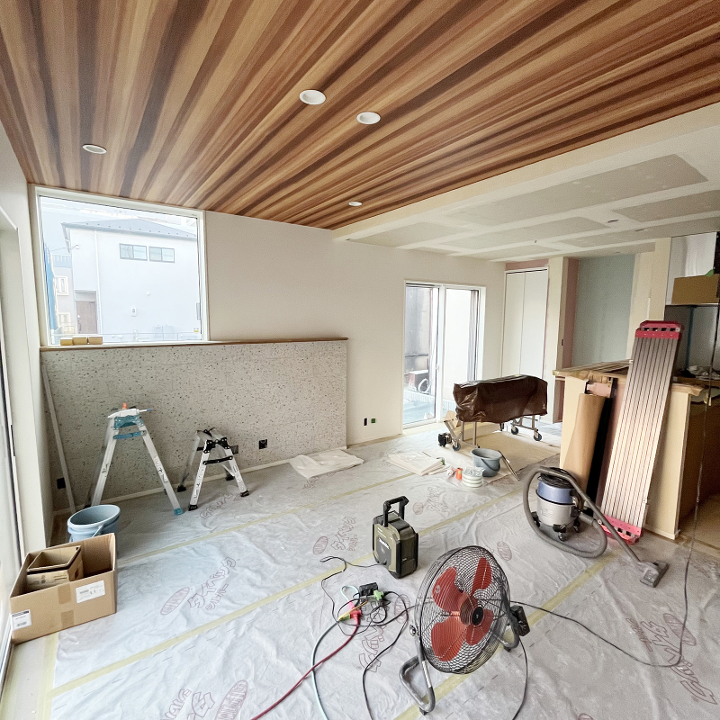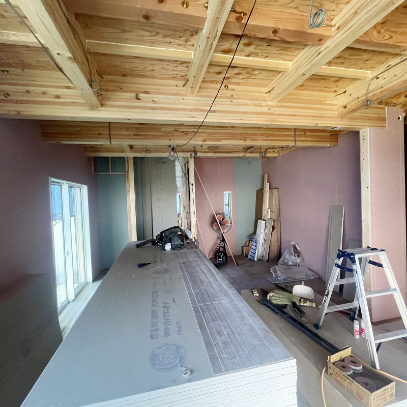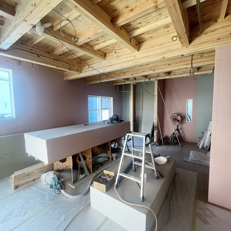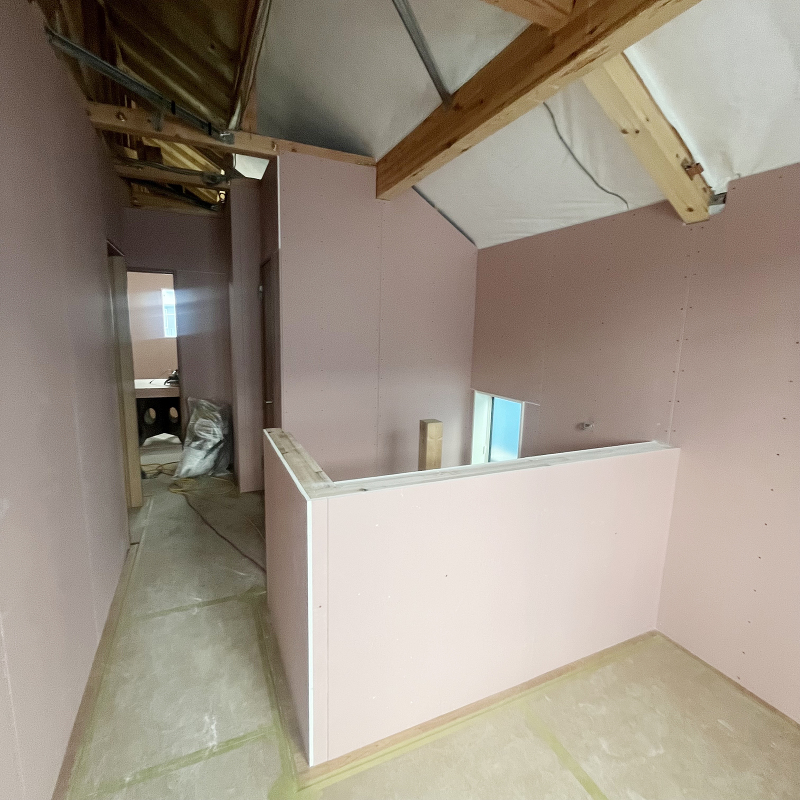 木工事 2階に石膏ボード「ハイクリーンボード」貼りが進んでいます。