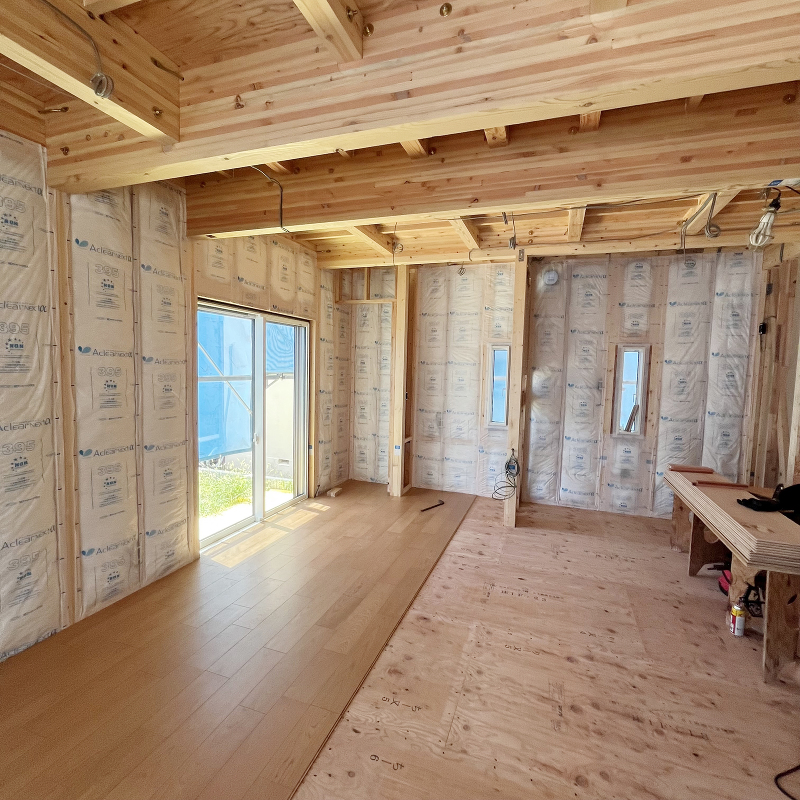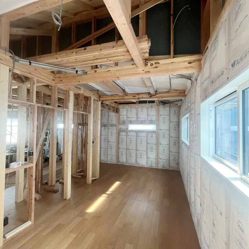木工事 2階断熱材の充填が進んでいます。