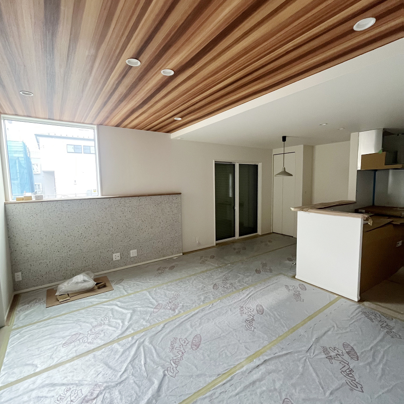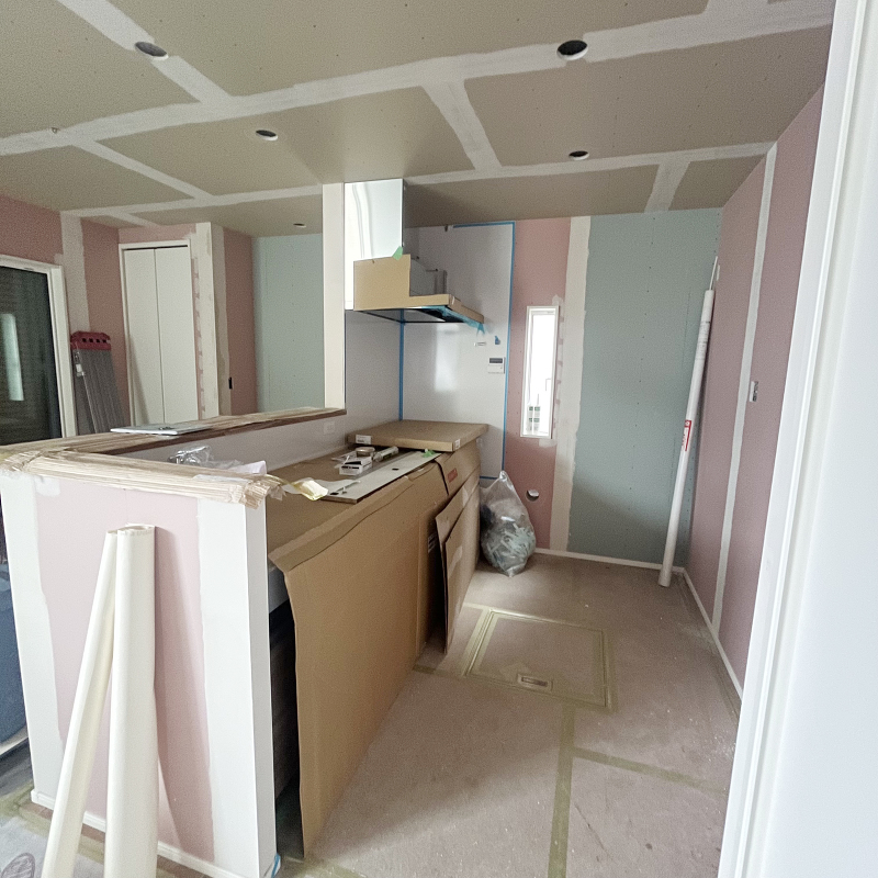木工事 壁面に石膏ボード「ハイクリーンボード」貼りが始まりました。