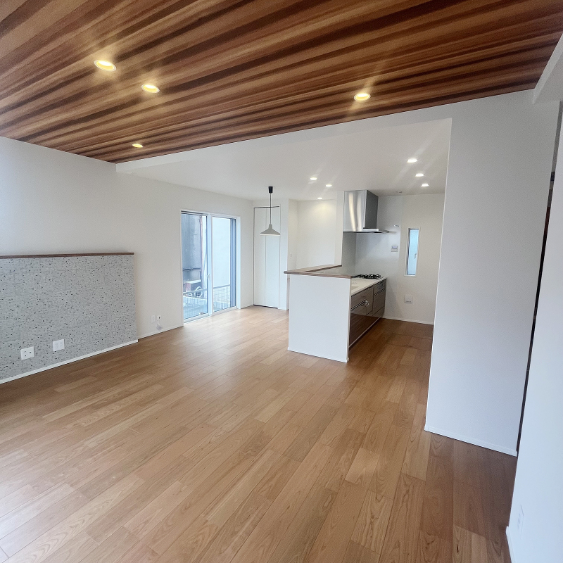 クリーニング 室内クリーニングをしています。リビングの壁面はコンクリート調のクロスがアクセントになっています。