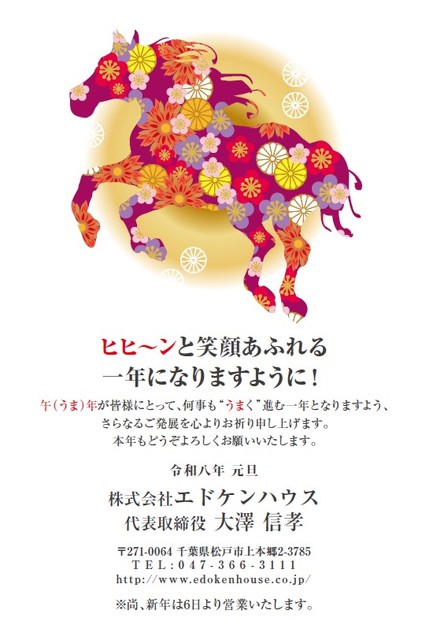 ホーム令和8年 社長あいさ... News&Topics 2026年1月1日 令和8年 社長あいさつ 明けましておめでとうございます。 本年もよろしくお願い致します。 2026年(令和8年)の十干の「丙(ひのえ)」と十二支の 「午(うま)」が組み合わさった「丙午(ひのえうま)」です。 丙(ひのえ)は十干の3番目で「火」の要素を持ち、太陽の明るさ、生命の エネルギーを表すとされています。 また午(うま)は、古くから人間とともに生きた動物。 駿足を持ち、独立心が強く、また人を助けてくれる存在でもあります。 そのため、丙午(ひのえうま)の年は「勢いとエネルギーに満ちて、活動的 になる」年と考えられています。 年賀状にも書きましたが、 「ヒヒ~ンと笑顔あふれる 一年になりますように!」 本年も変わらぬお引き立ての程よろしくお願い申し上げるととも に皆様のご健勝とご発展を心からお祈り申し上げます。 株式会社エドケンハウス 代表取締役大澤 信孝